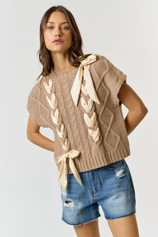 SATIN BOW CABLE KNIT SWEATER VEST TOP