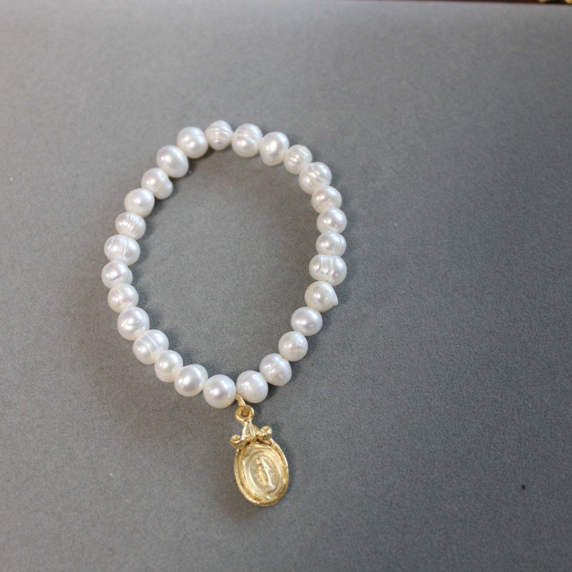 Pearl Stretch Bracelet with Virgin Mary Medal